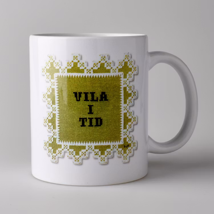 Vit mugg med fotografi av broderi med texten