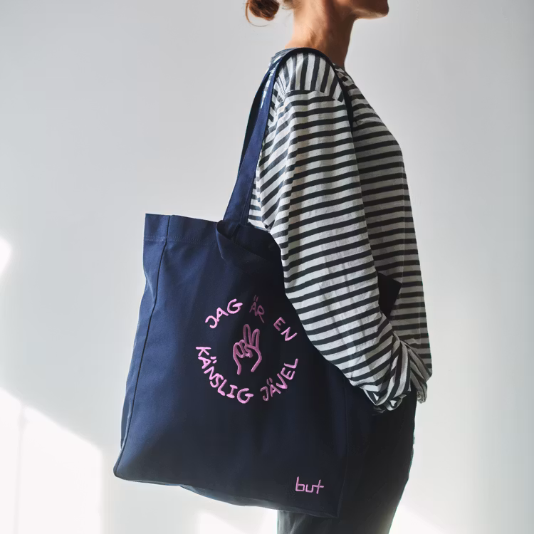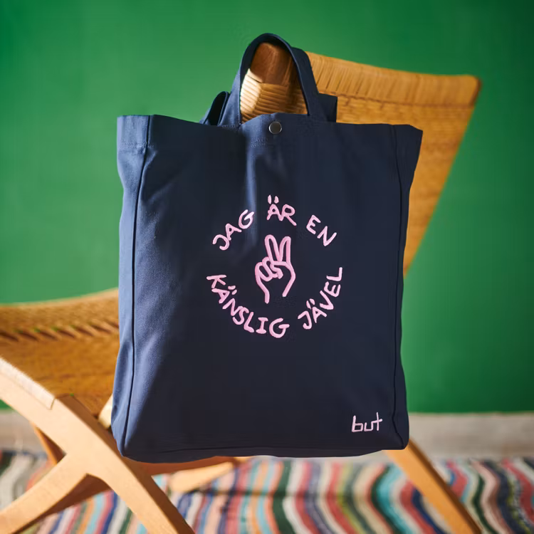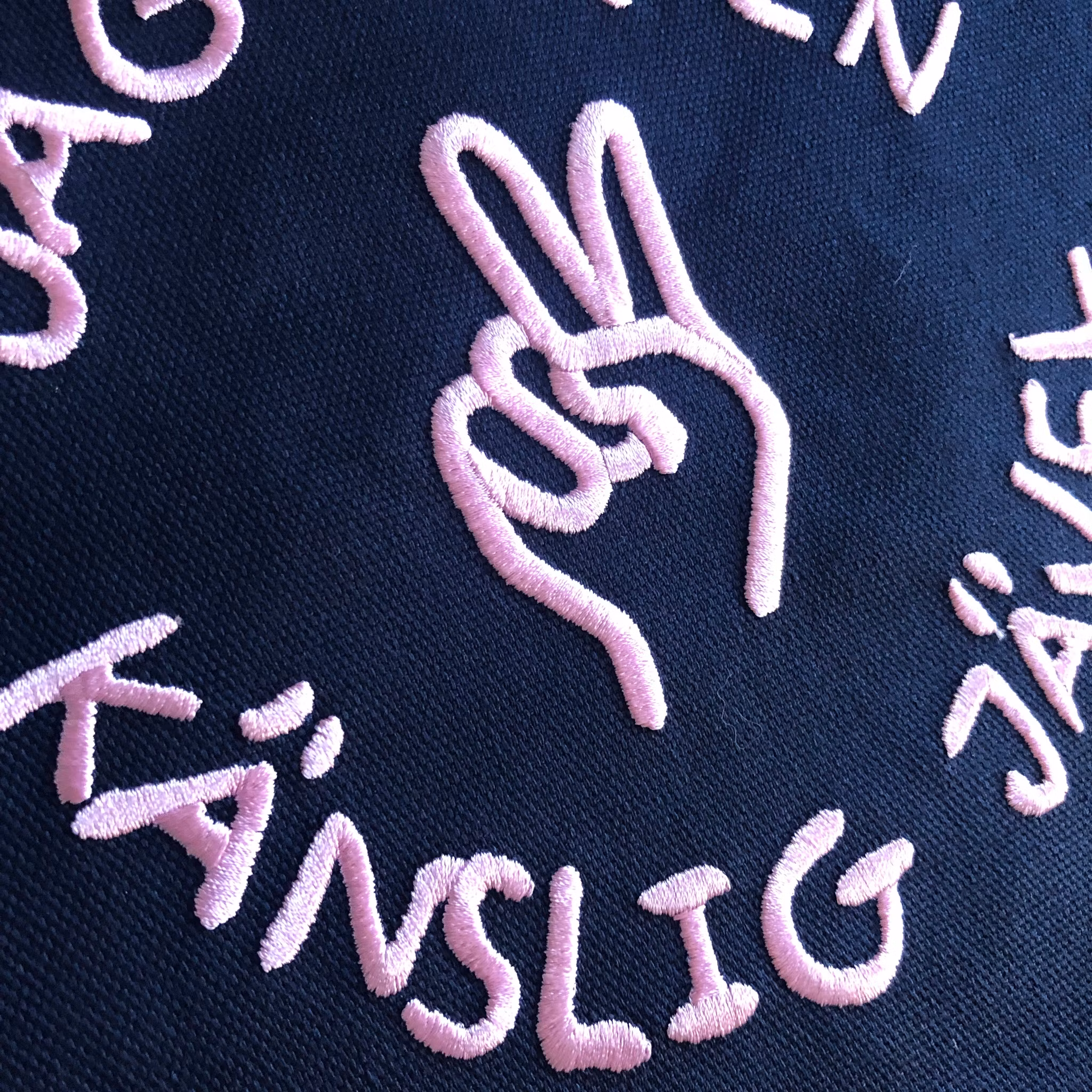 Rosa maskinbroderat motiv: ett broderat V-tecken i mitten med texten "JAG ÄR EN KÄNSLIG JÄVEL" runt tecknet.