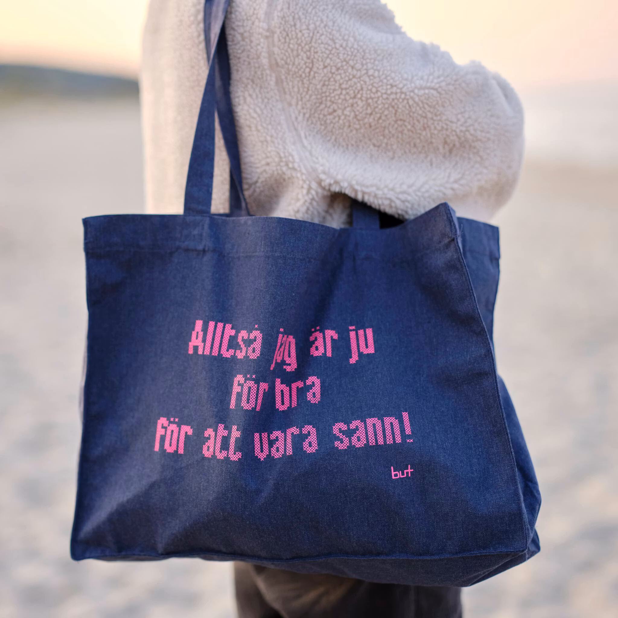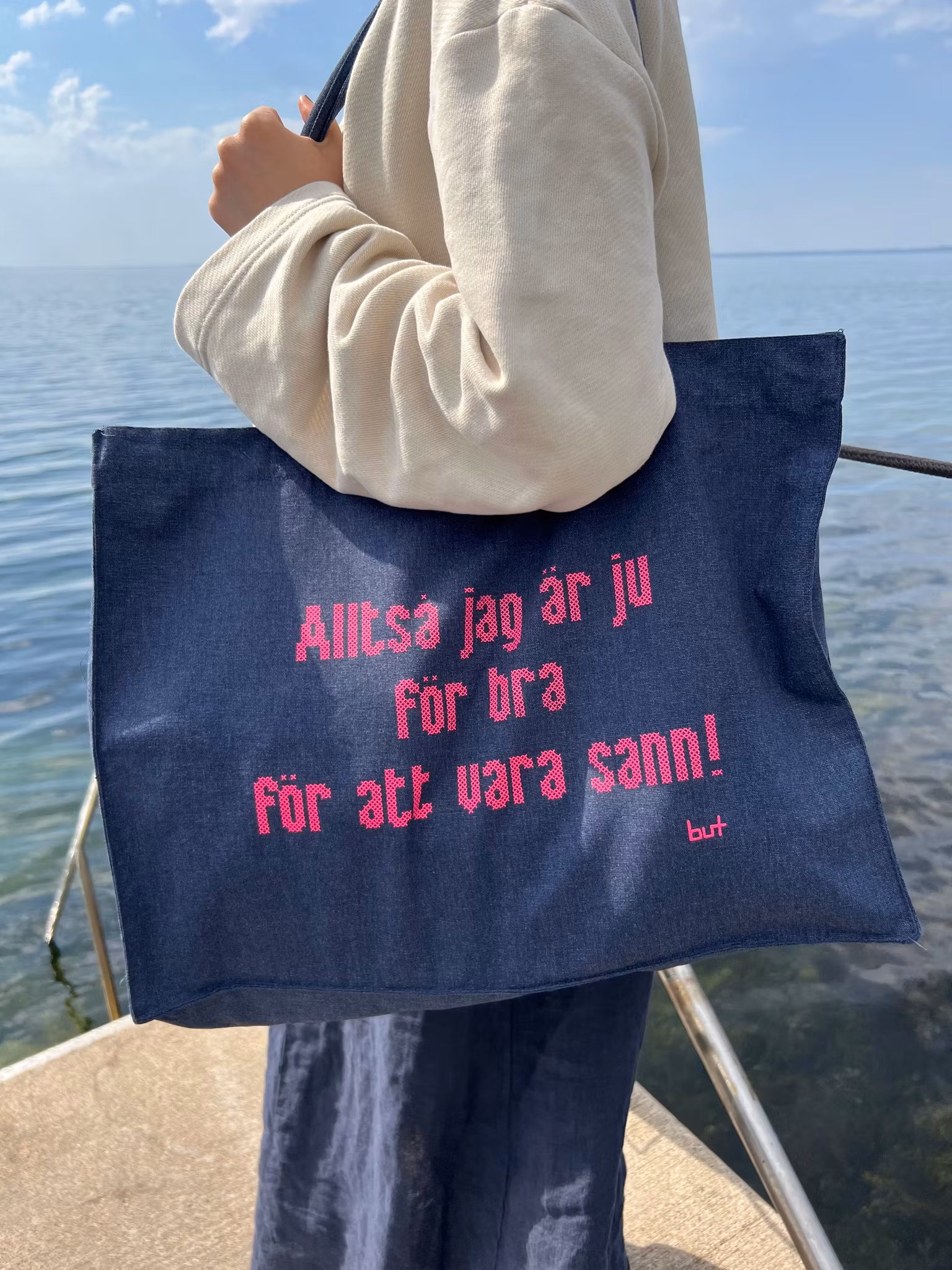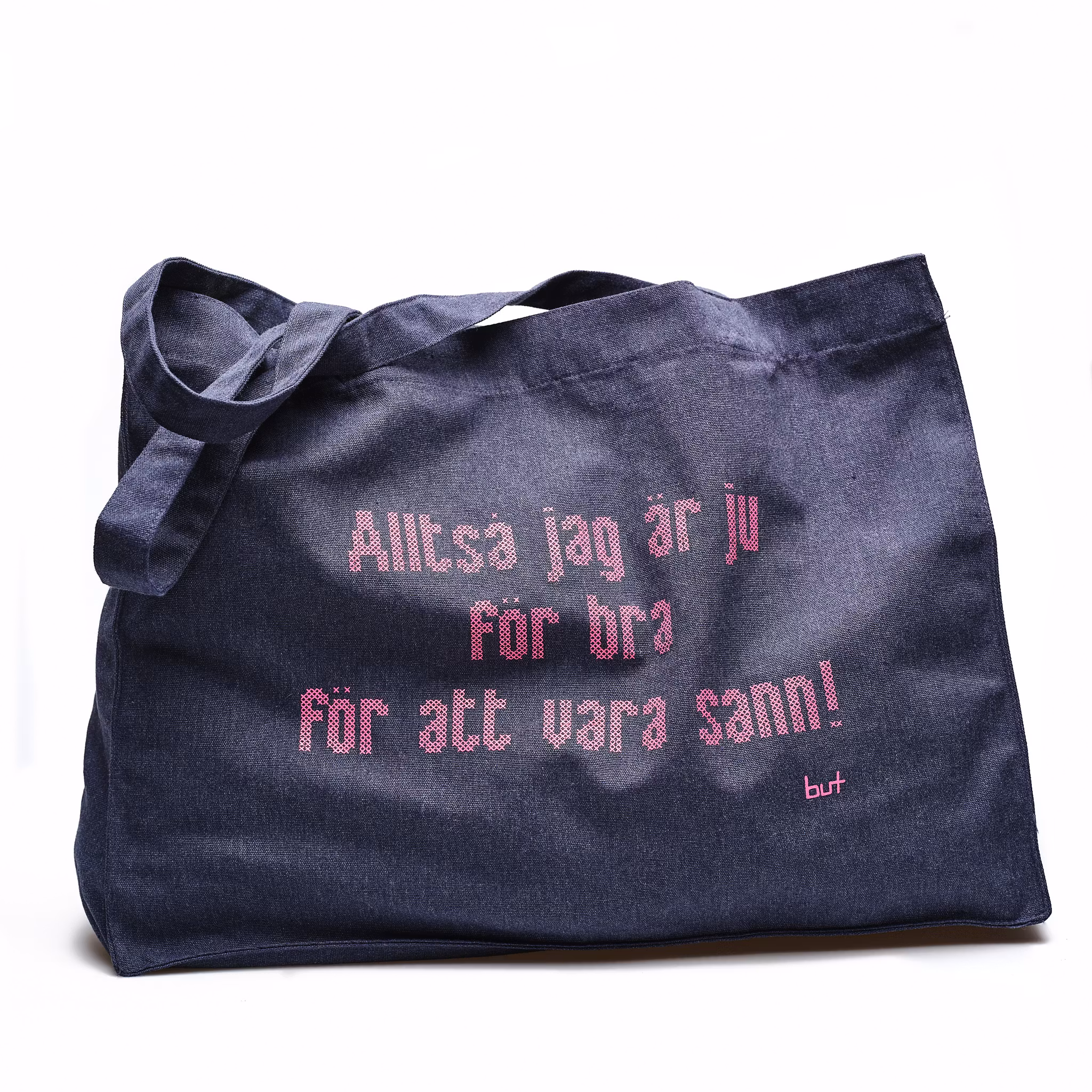 Jeansblå väska med neonrosa tryck med texten "Alltså jag är ju för bra för att vara sann!"