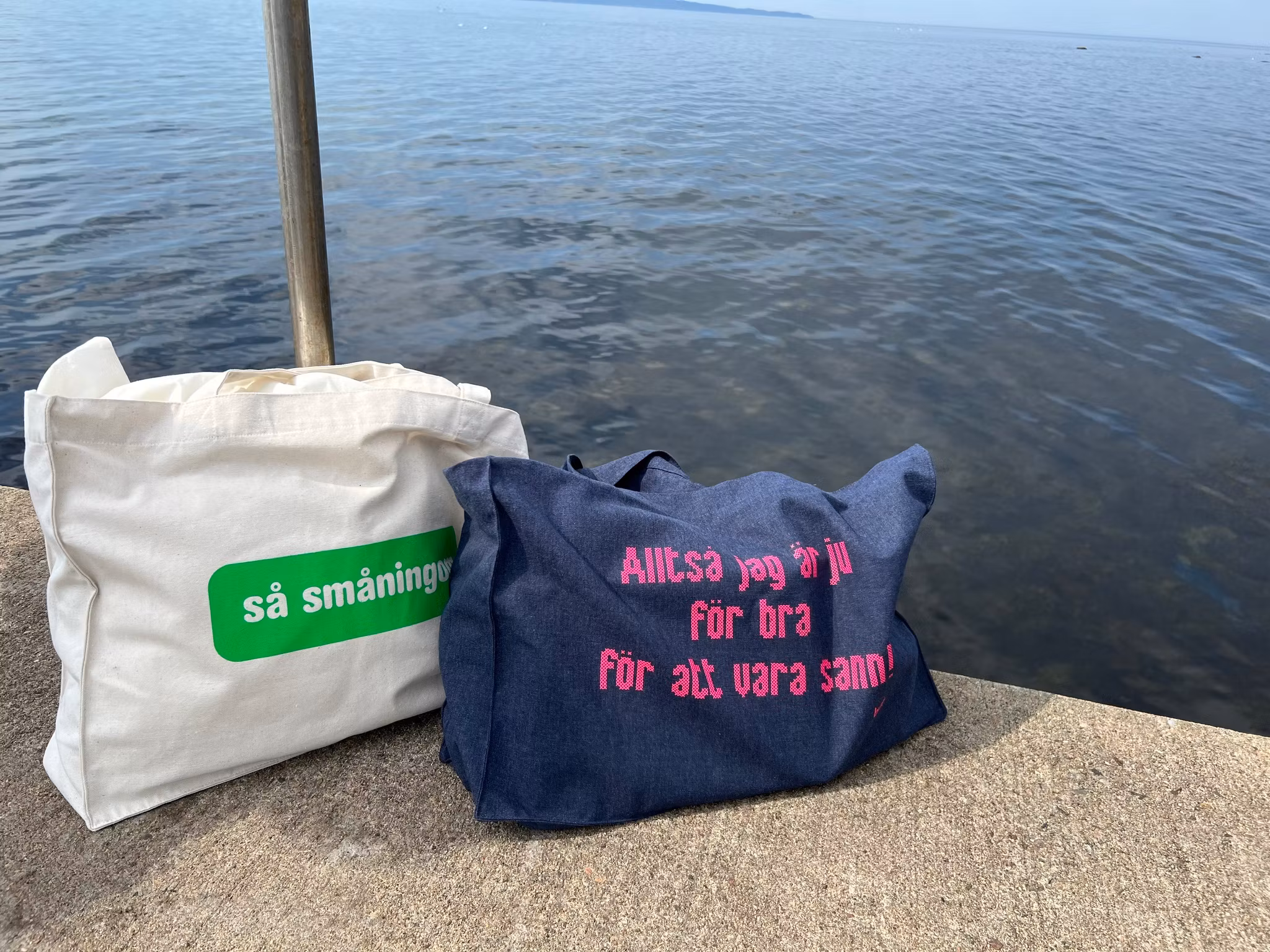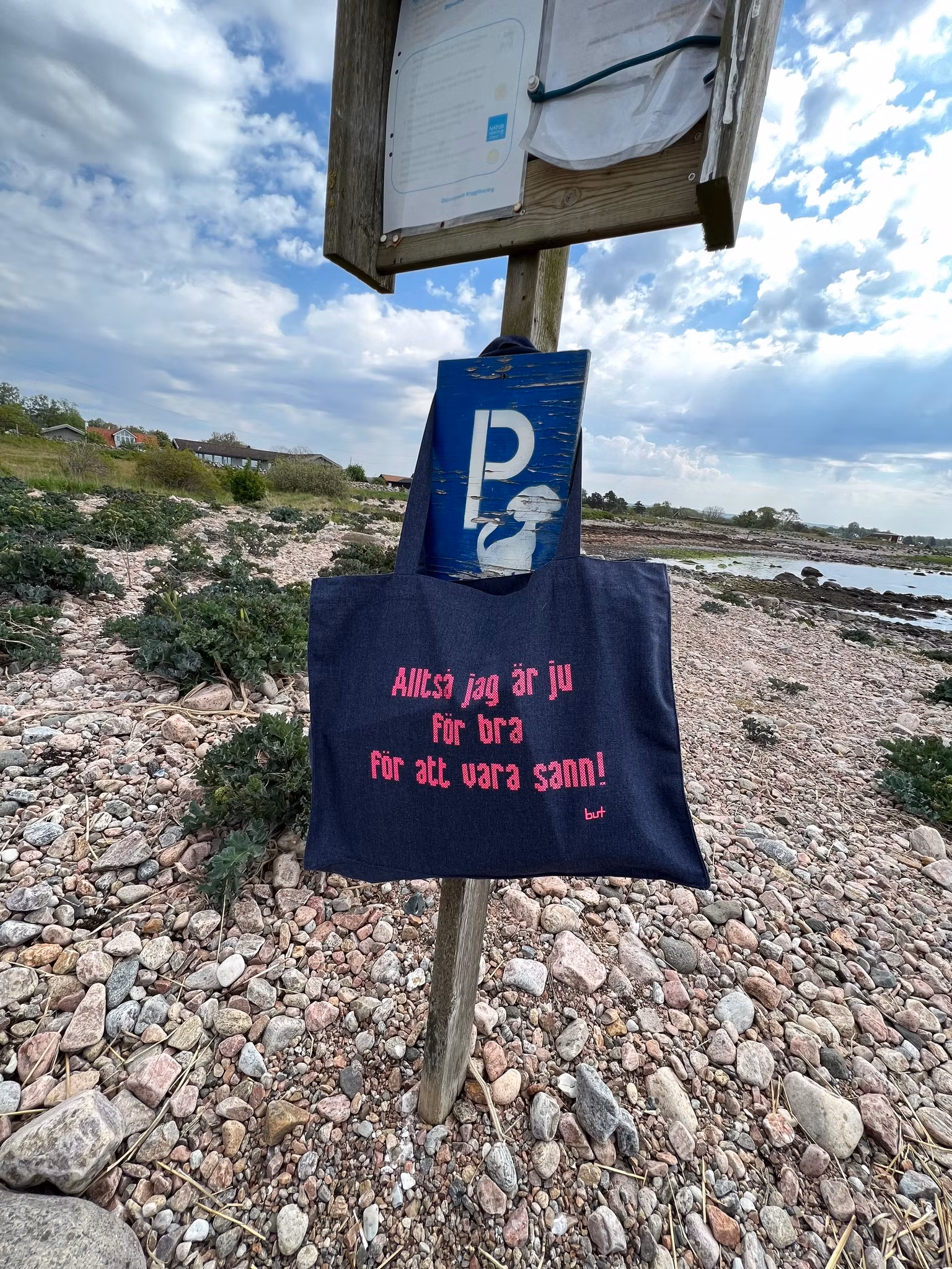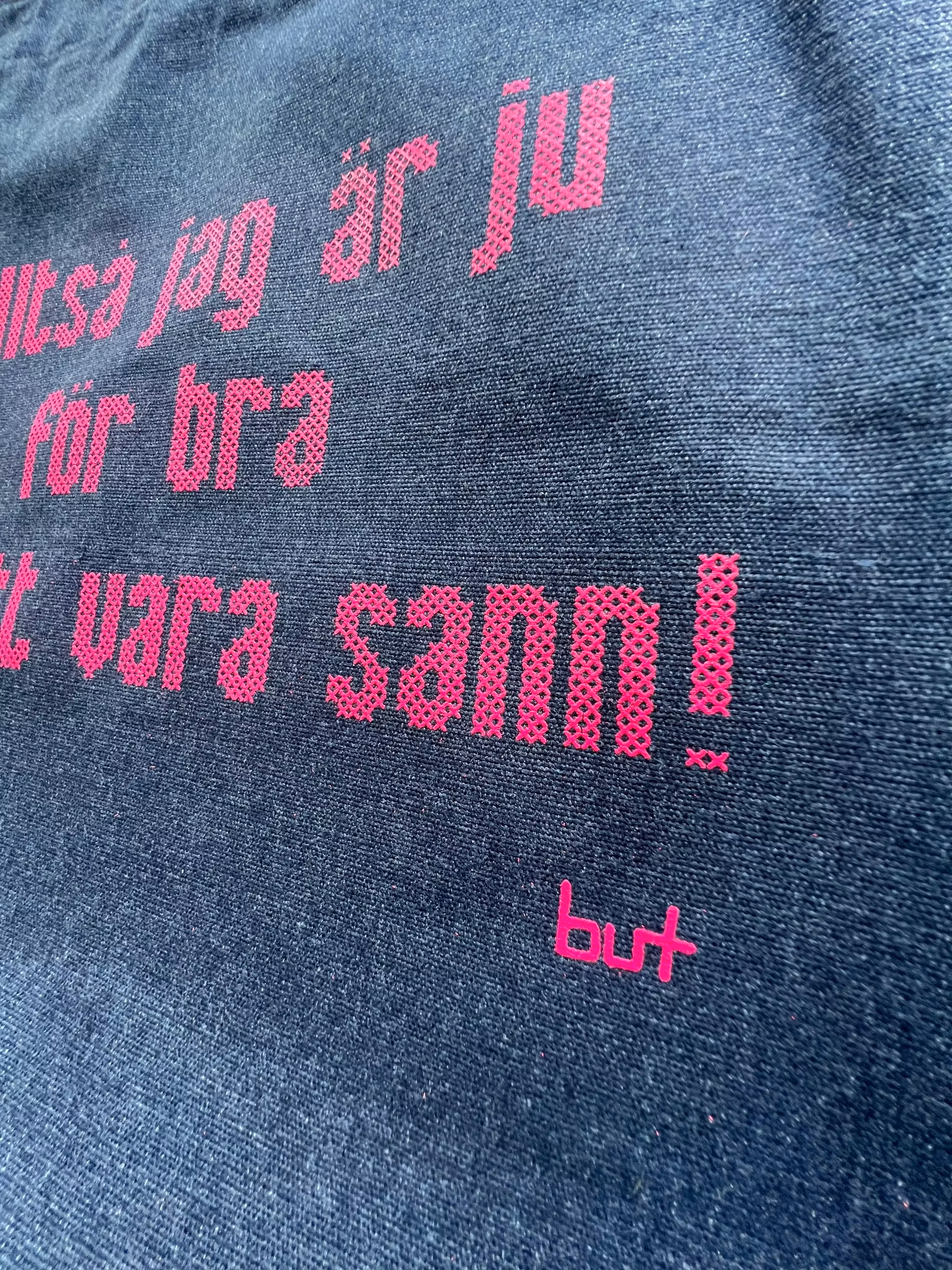 Jeansblå väska med neonrosa tryck med texten "Alltså jag är ju för bra för att vara sann!"