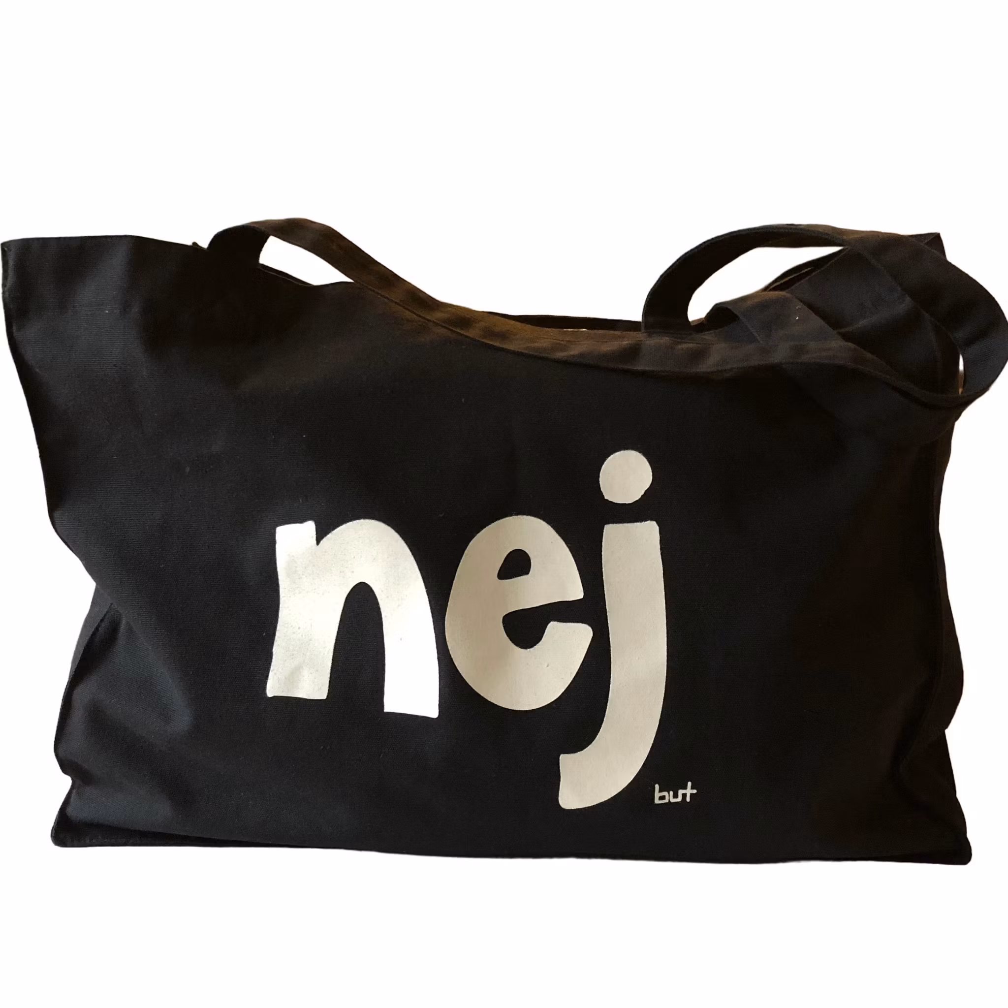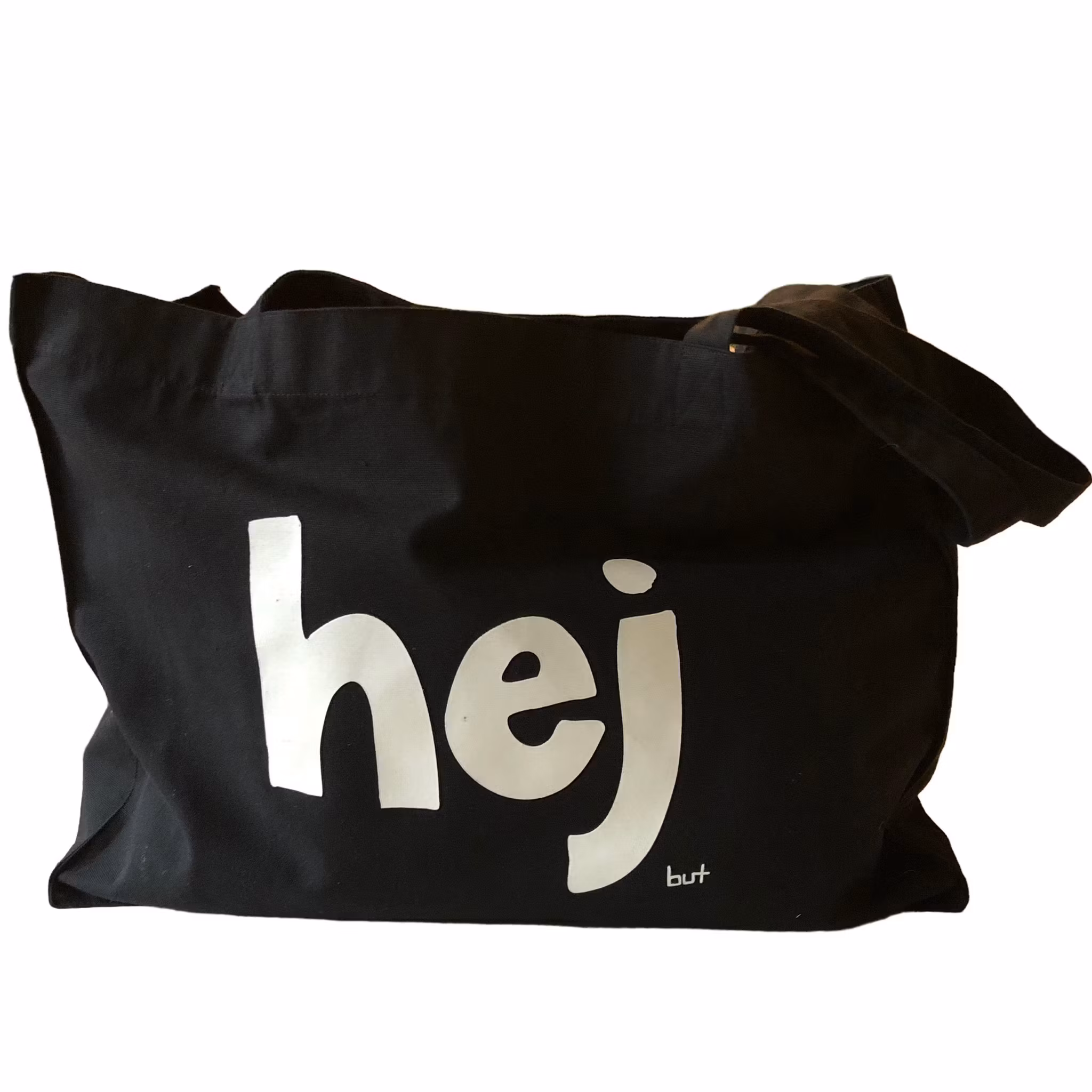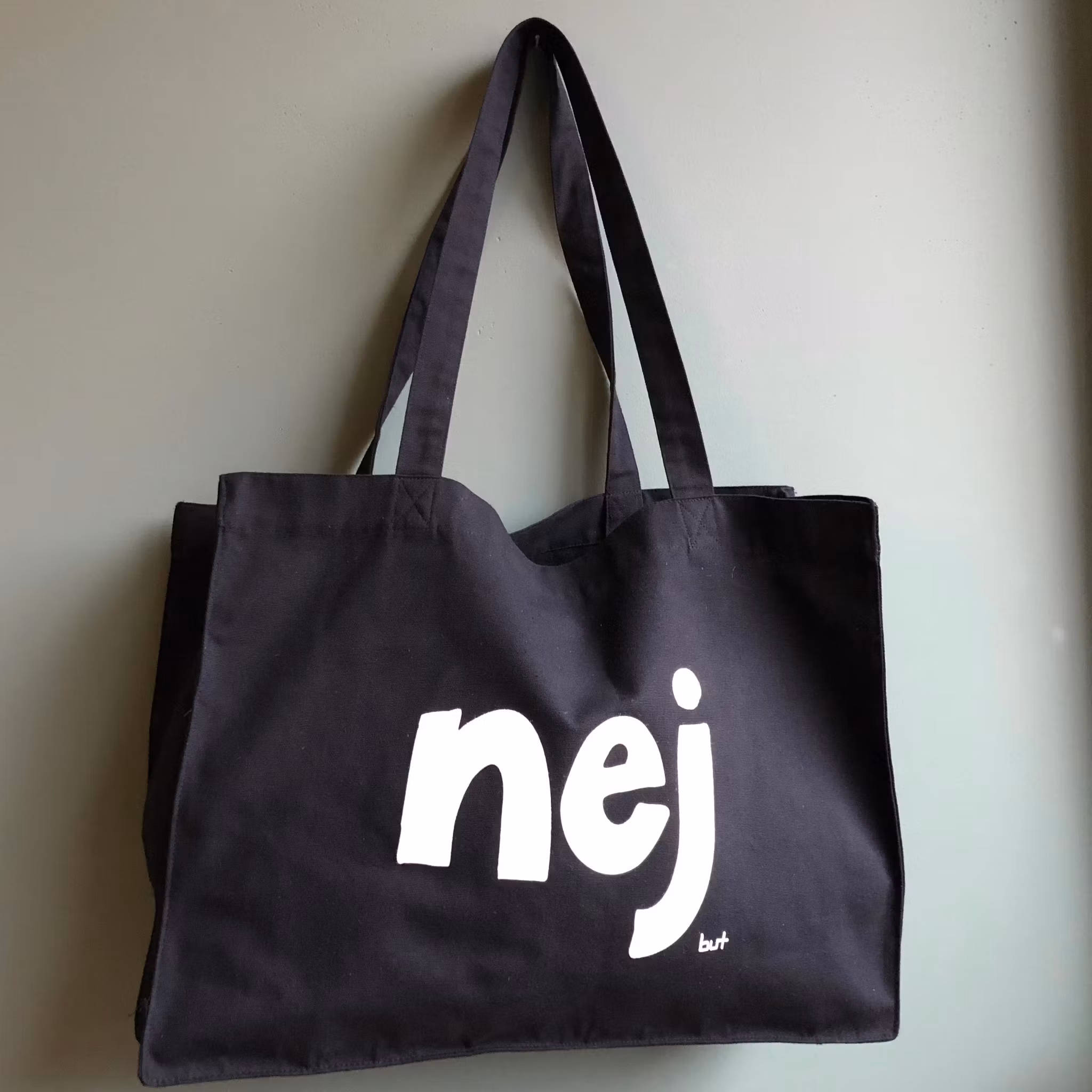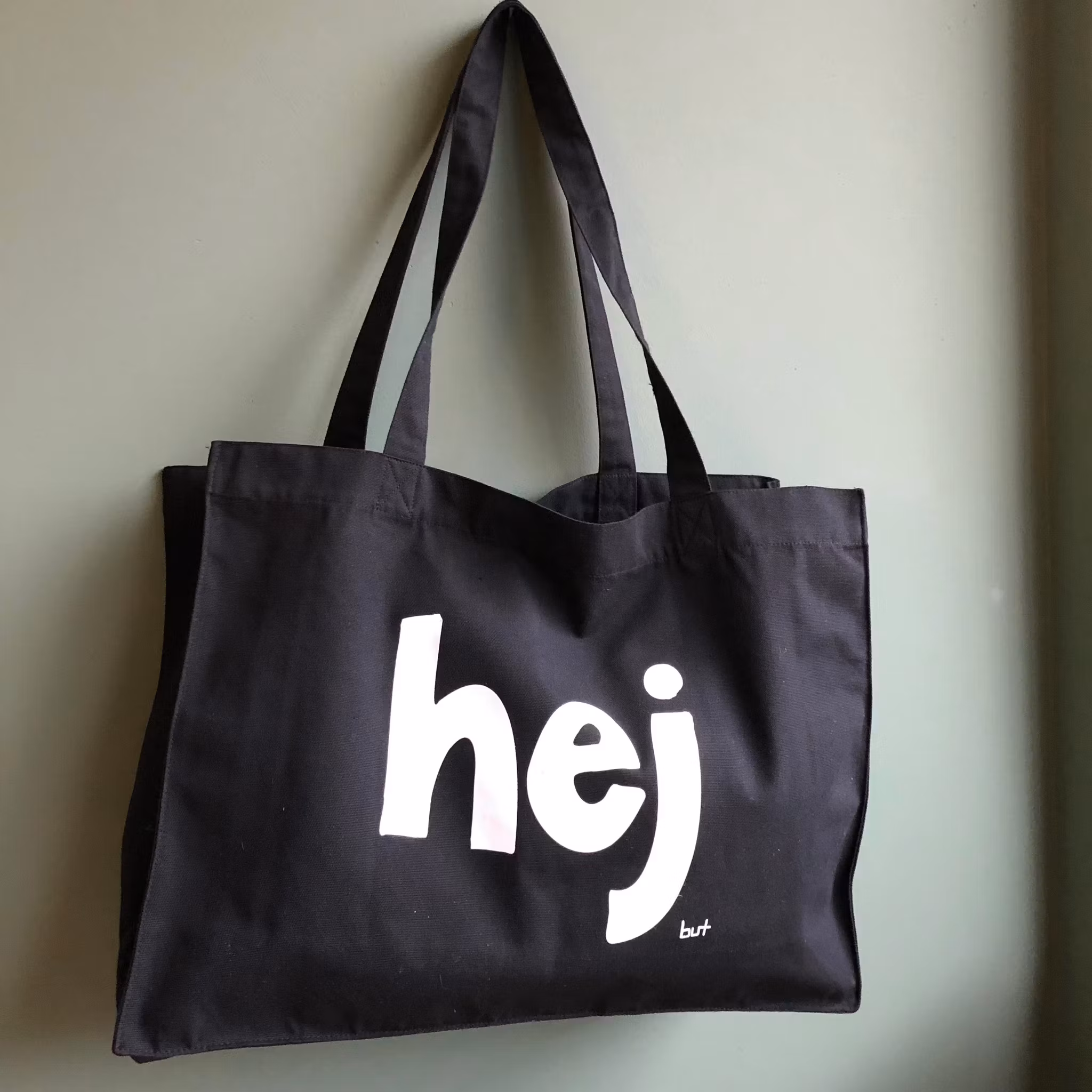 Väskan har tryck på båda sidor, på ena sidan texten "hej" och på den andra sidan texten "nej"
