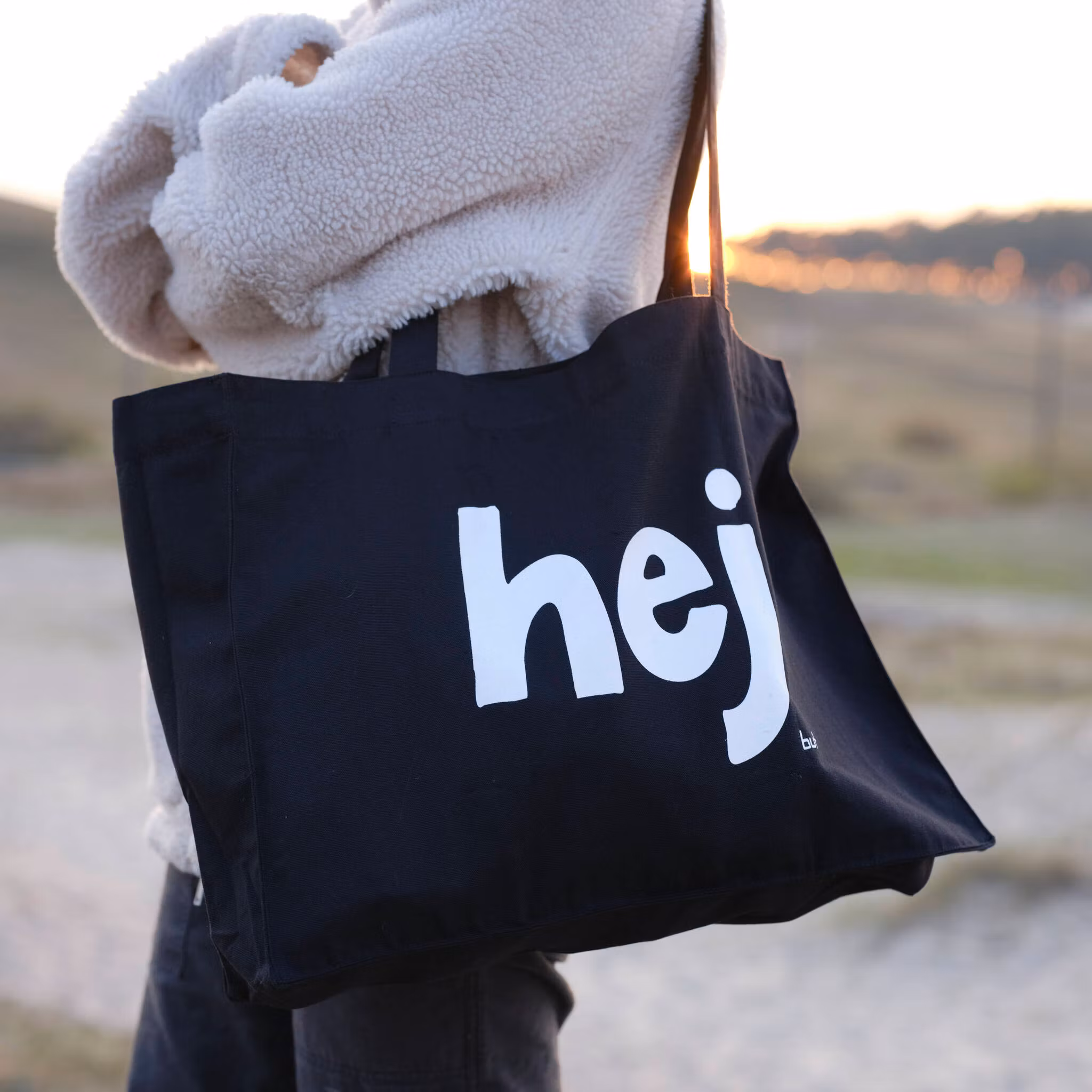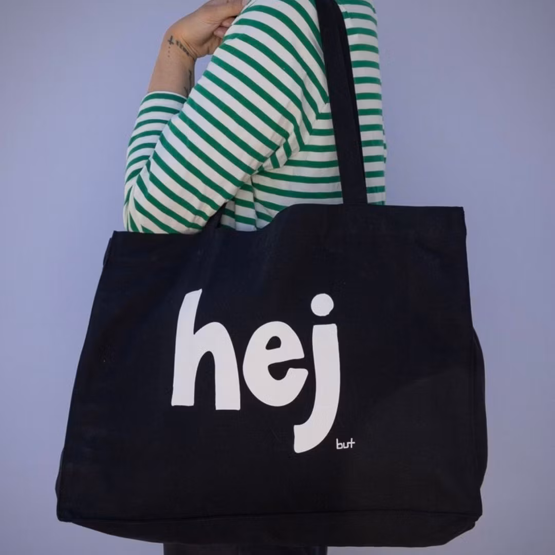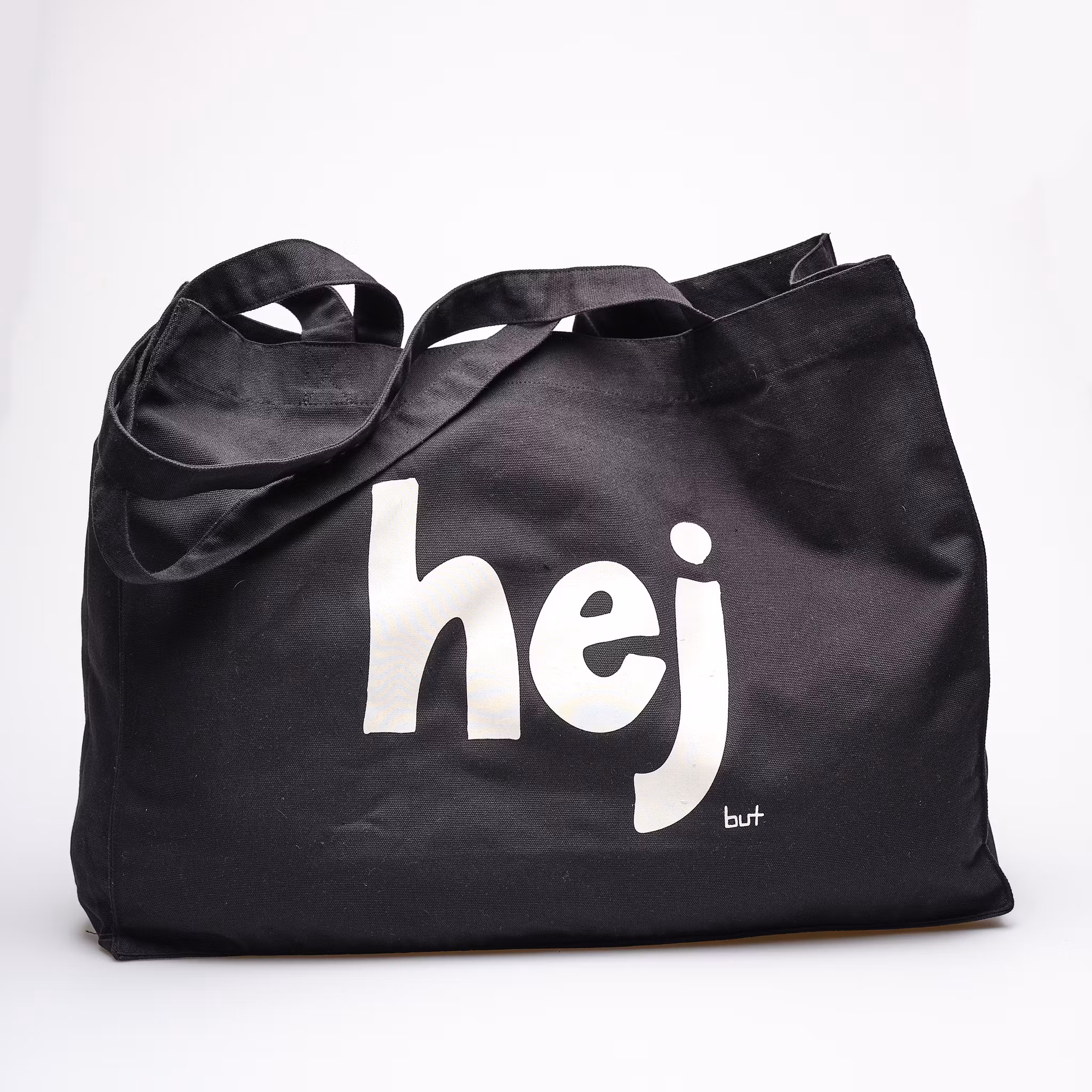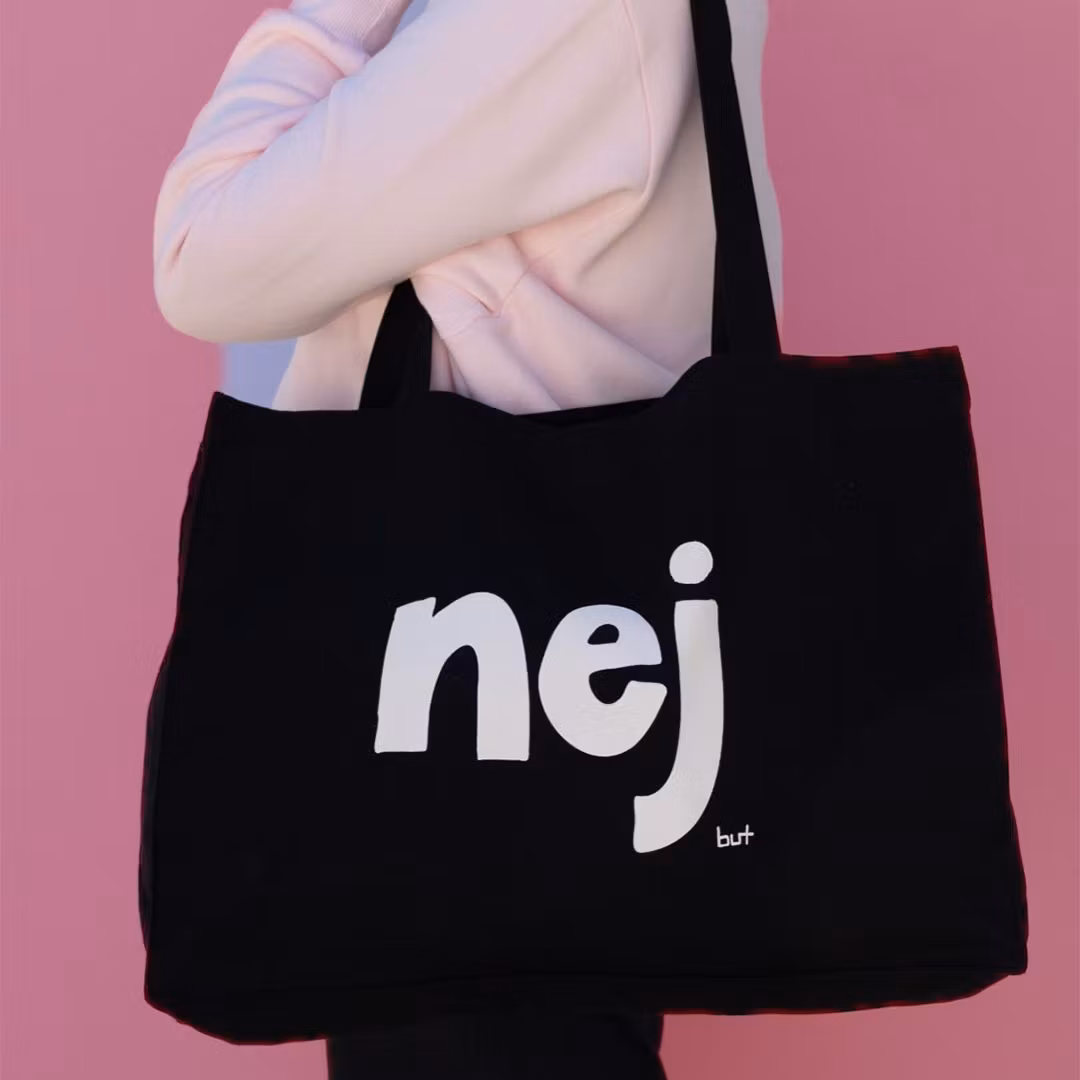 Väskan har tryck på båda sidor, på ena sidan texten "hej" och på den andra sidan texten "nej"