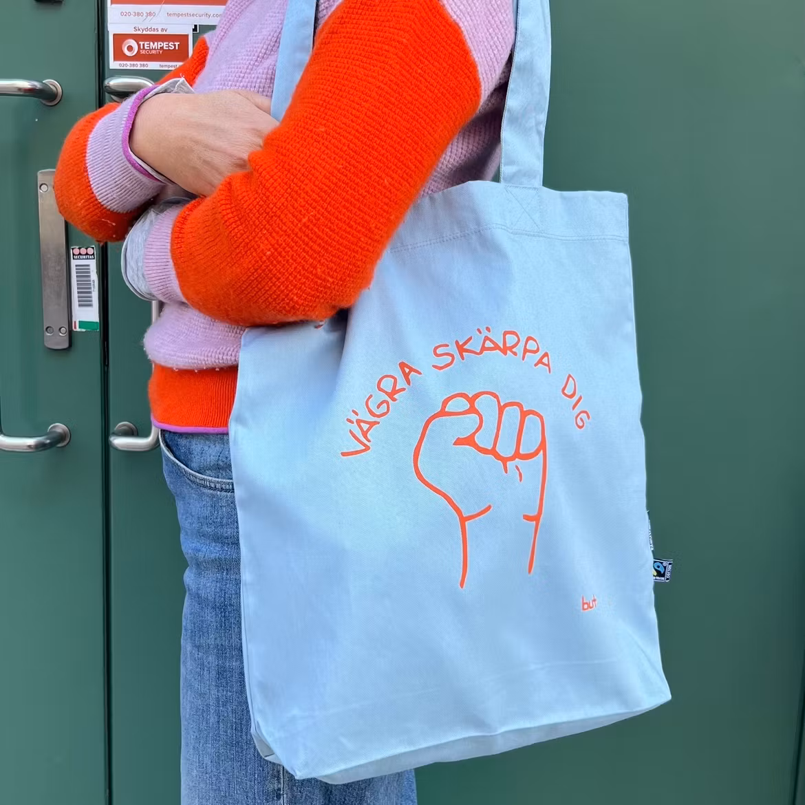 Ljusblå väska med orange tryck.