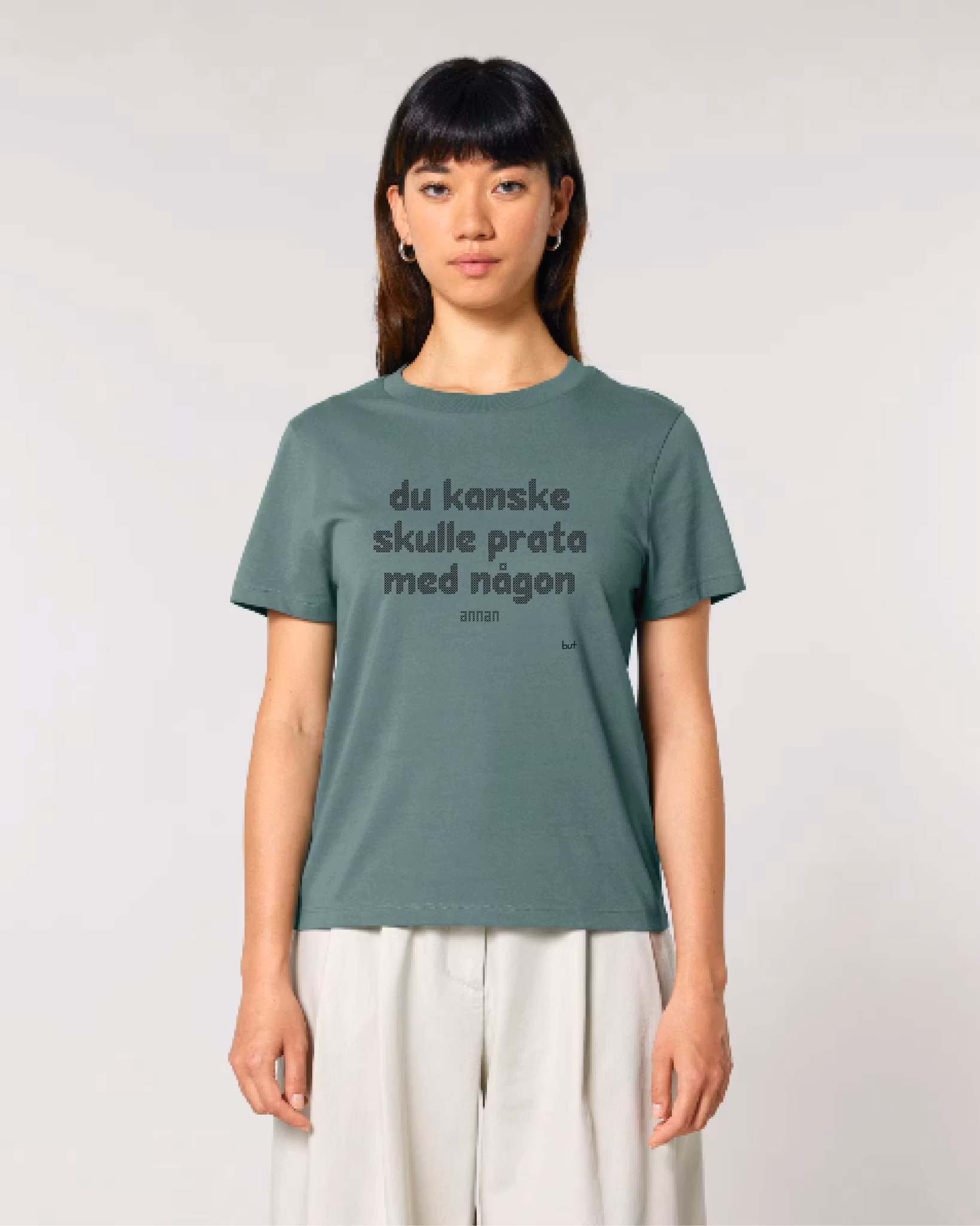 Text på tröjan: "du kanske skulle prata med någon annan"