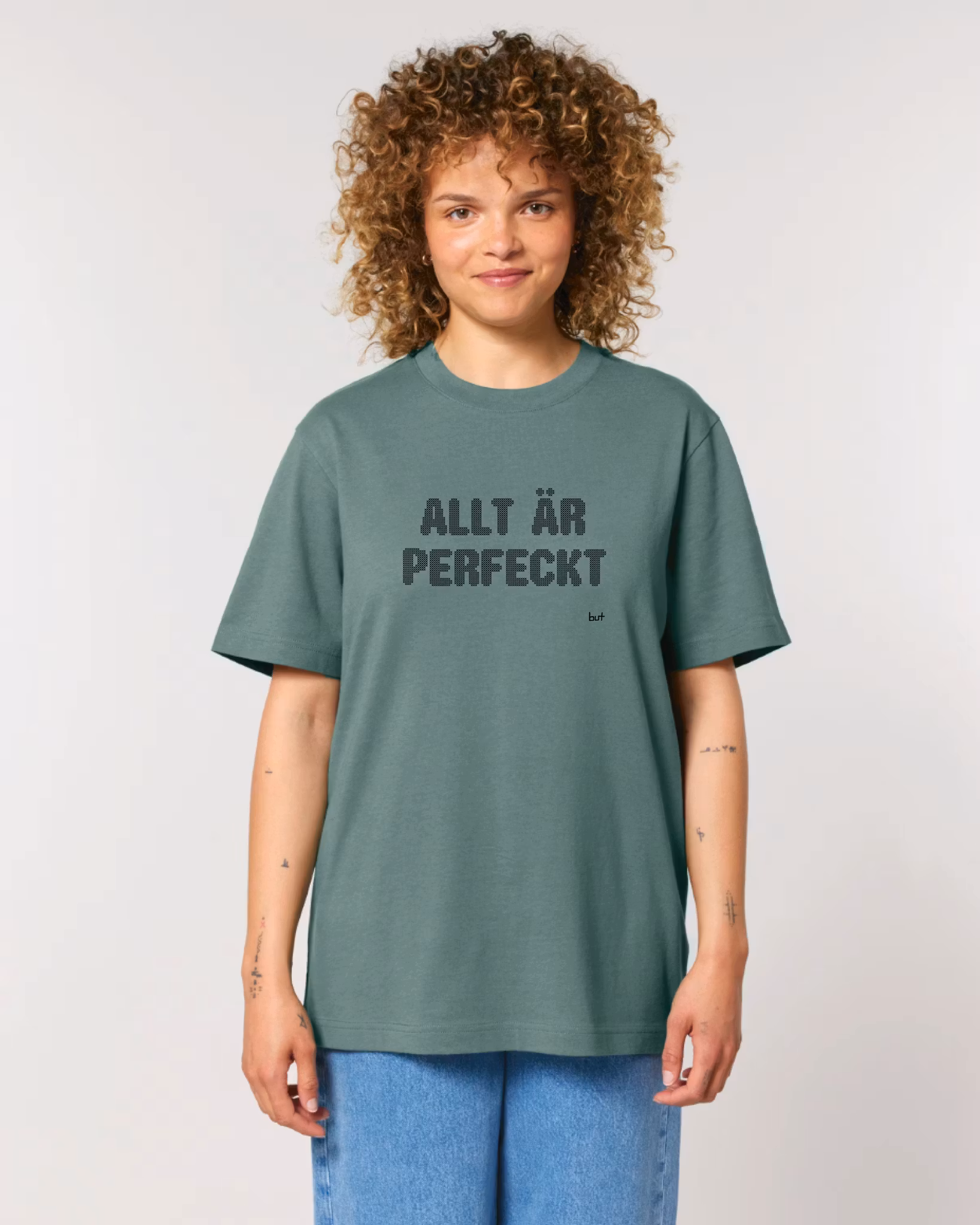 Text på tröjan: "ALLT ÄR PERFECKT".