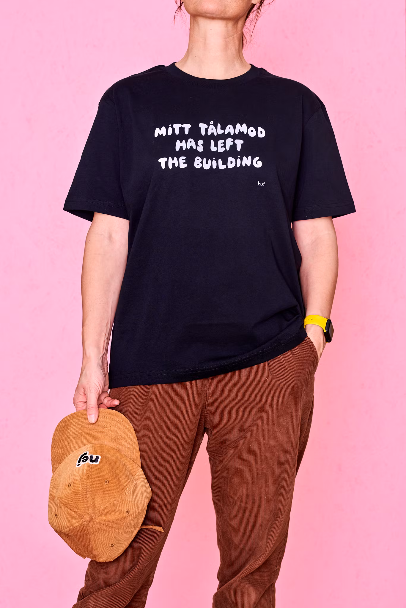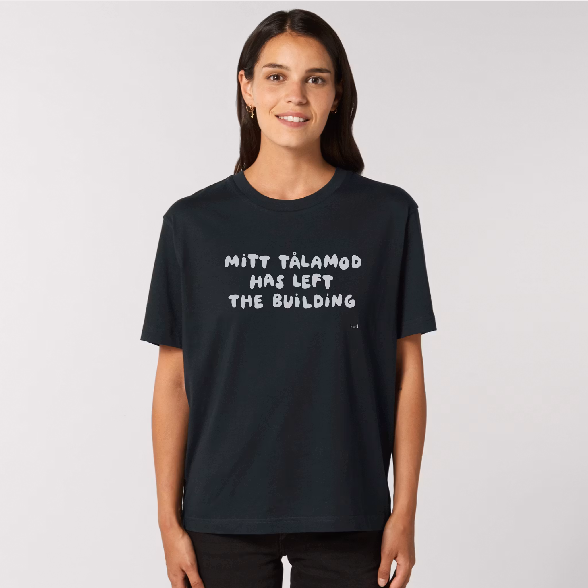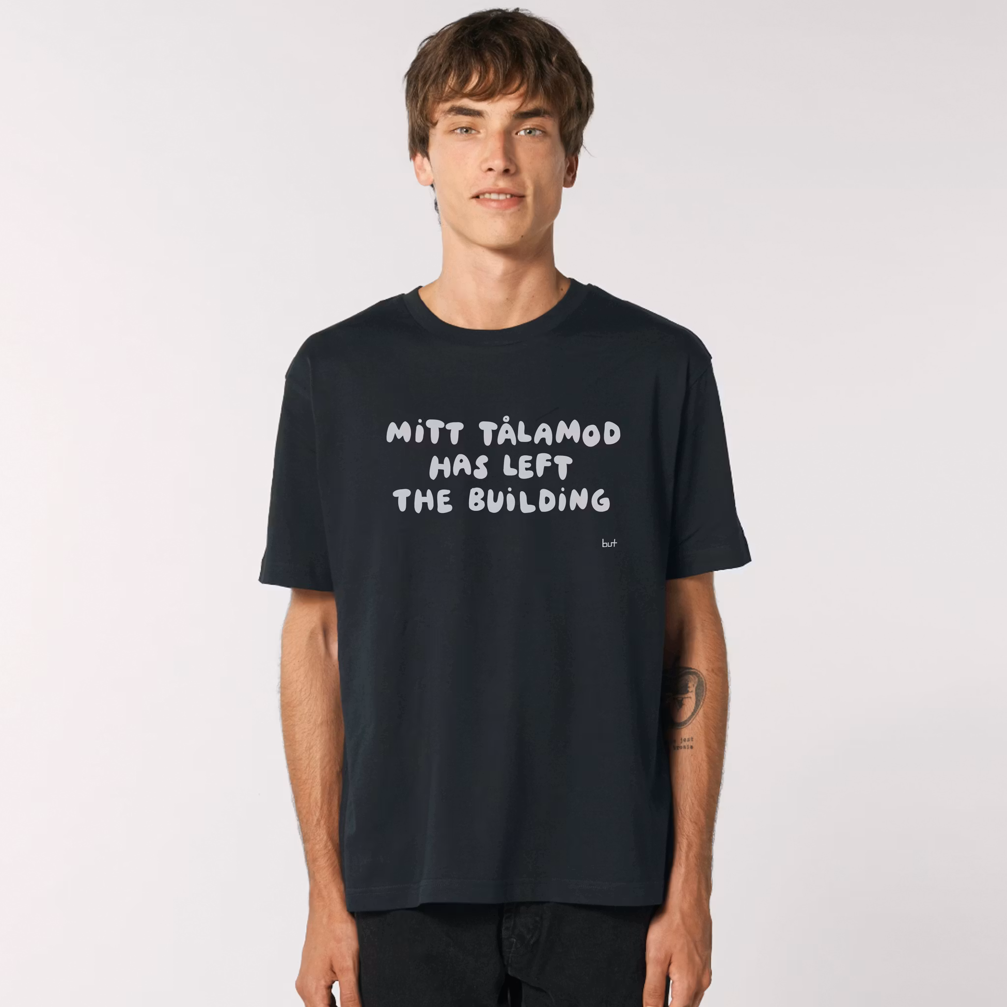 Text på tröjan: "MITT TÅLAMOD HAS LEFT THE BUILDING".